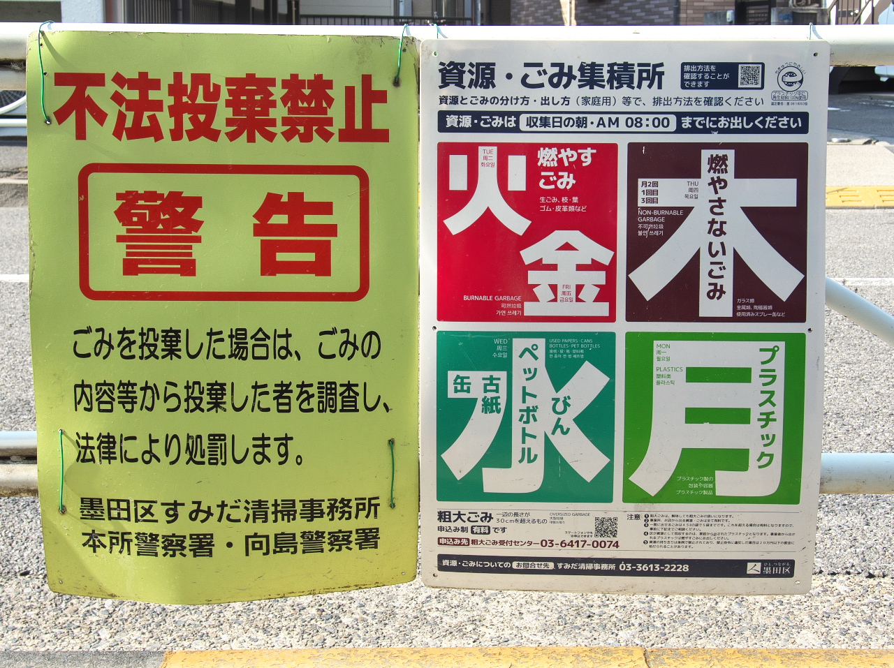 おそらく、令和6年(2024年)のプラスチック類資源化に伴う4分別化に伴い、新しい看板と一緒に警告の看板が追加されたものだろう。看板には、すみだ清掃事務とともに本所警察署、向島警察署の名称がある。この二つの警察署で墨田区全域をカバーしている(墨田区と所管警察署)。